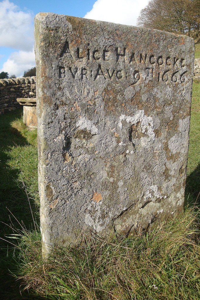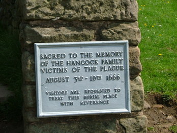 The first of Elizabeth’s family to sicken were John Hancock Junior (aged 6- baptised in 1660) and her daughter, Elizabeth (aged 8- baptised in 1658), both dying on 3rd August 1666. Three more of the Hancock family died on 7th August 1666; including John Hancock, Elizabeth’s husband, her son William (for whom no baptism date is given in the parish records) and her youngest child, her daughter Oner (aged 3- baptised in 1663). Alice (aged 15- baptised 1651) followed her father and siblings into the grave on 9th August 1666 and Ann (aged 10- baptised 1656) on 10th August 1666, leaving their mother alone at Riley. The parish records also mention a daughter named Joan, baptised on Christmas Eve 1654 in Eyam, who would have been 12 at the time of plague, but she is not buried in the Riley Graves and nor does historical tradition mention her, perhaps suggesting she had died prior to the epidemic.