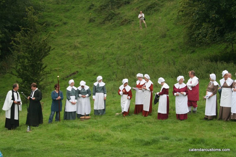 Beginning with the laying of a wreath at Catherine Mompesson’s tomb in the churchyard, a procession then starts from St Lawrence’s Church and makes its way to Cucklett Delph. At 3pm the annual Plague Sunday service begins. Hymns are sung and many villagers dress in seventeenth century costume and act out tableaux of scenes from the village’s year fighting the plague.
